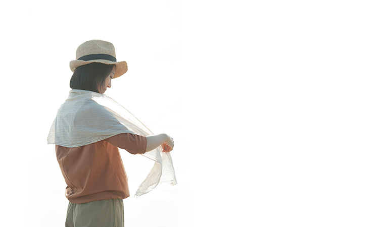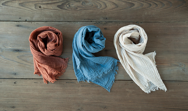 オーガニックコットン100%のこちらのストールは手触りが心地よく、汗ばむ今の季節にぴったり。